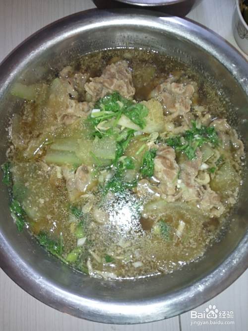 把水烧好后,然后把冬瓜、羊肉、葱花放入锅中,快煮好后放入海米和香菜