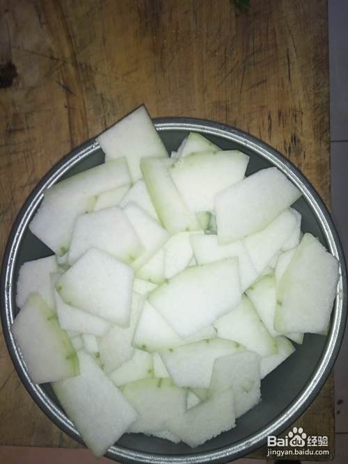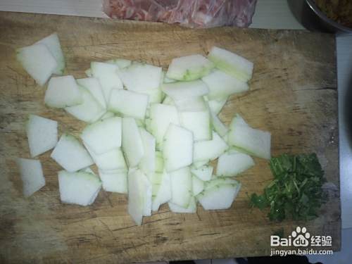 把冬瓜洗好、切成片,香菜洗好、切成段、葱花洗好、切成段备用