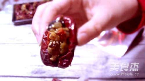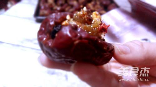 10白芝麻最后放,搅拌后,马上趁热用小勺子夹入大枣中,此处感谢宝儿爹的合作,两人一起装会快些哦,根本没时间拍照了,快快快,当时可是心跳加速哦,就怕凉了就硬了不能装!