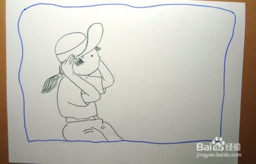 铅笔画个草稿布局,用黑色的水彩笔,先从看风景的小女孩帽子开始画,并画出女孩的头发、眼睛和嘴巴,如下图所示。