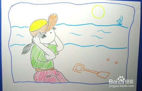 最后用橙色的水彩笔给小女孩的沙滩上,画出一个小铲子,表示小女孩在玩沙子,如下图所示。这样海滩看风景的小女孩,就画好了,大家也来画画吧。