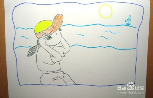 接着,用橙色的水彩笔给小女孩的帽子涂上颜色,并用蓝色彩色笔画出海平面的线条,如下图所示。