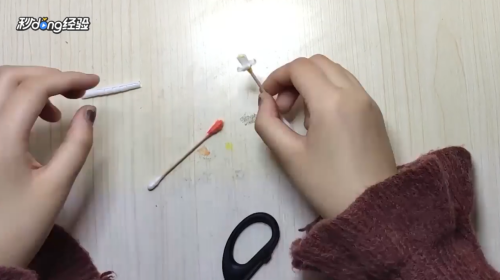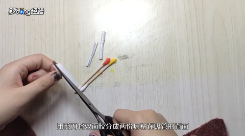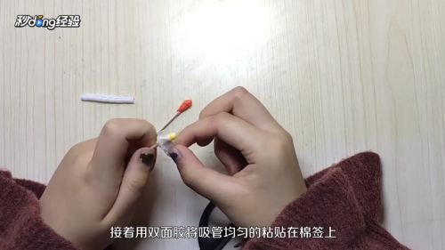 7撕掉双面胶,用双面胶将吸管均匀的粘贴在棉签上。