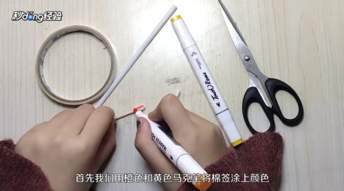 1用橙色和黄色马克笔将棉签涂上颜色。