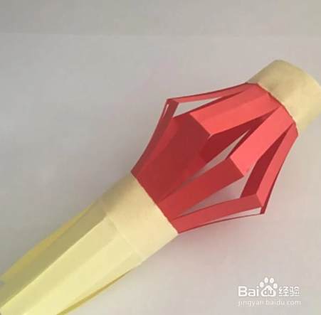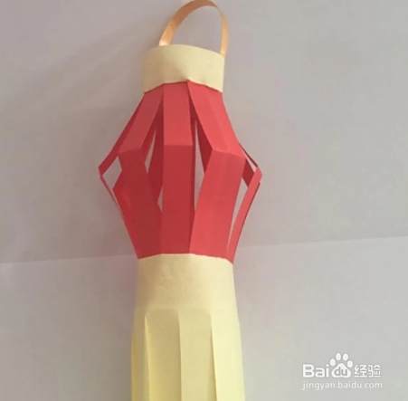 将2厘米的长条用双面胶黏在刚才灯笼形状的一头,剩下的黄色流苏也用双面胶将其黏在灯笼形状的另一头。
