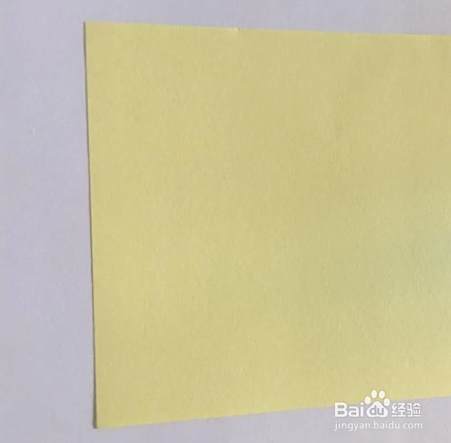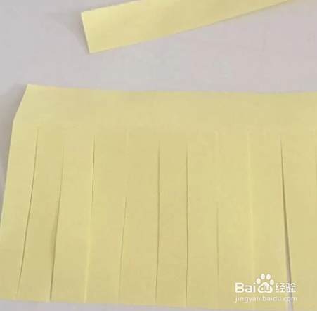 将黄色的方形纸用剪刀裁剪下,剪一条2厘米的长条,剩下的纸也折2厘米的边出来,在2厘米边的折痕下方用剪刀剪出流苏样