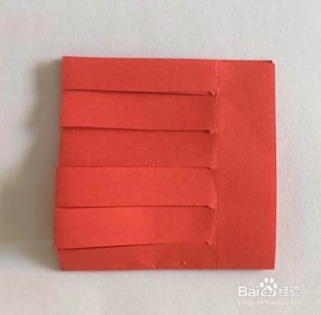 将对折的长方形左右对折成小正方形,用剪刀将折痕下的地方剪成均匀的流苏样。