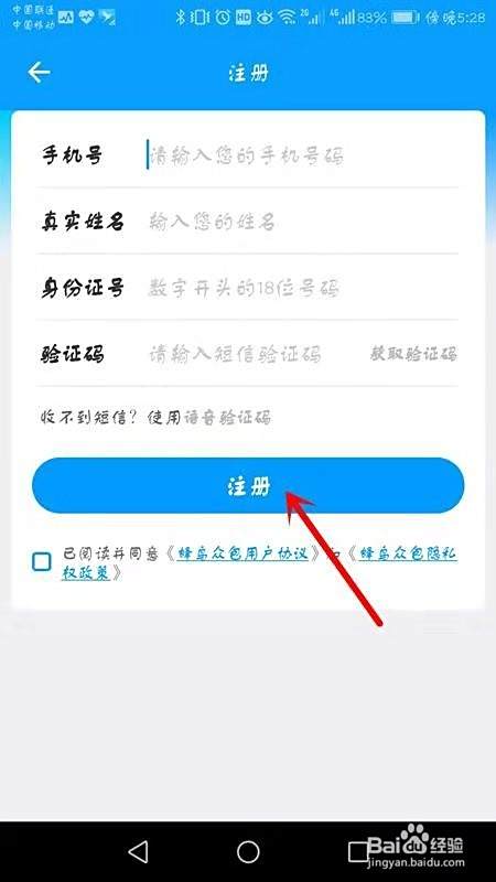 1、点开蜂鸟众包应用,输入自己的真实信息,点击注册。