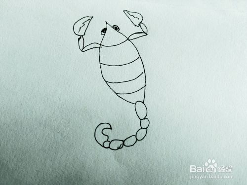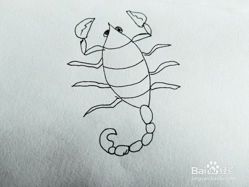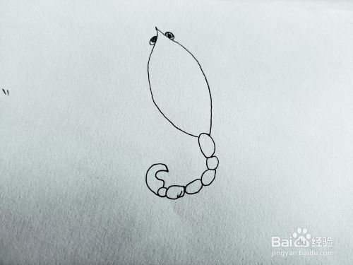 第二步,我们来画大蝎子的尾巴,带针的尾巴,还有大蝎子的头上的两只眼睛,如下图