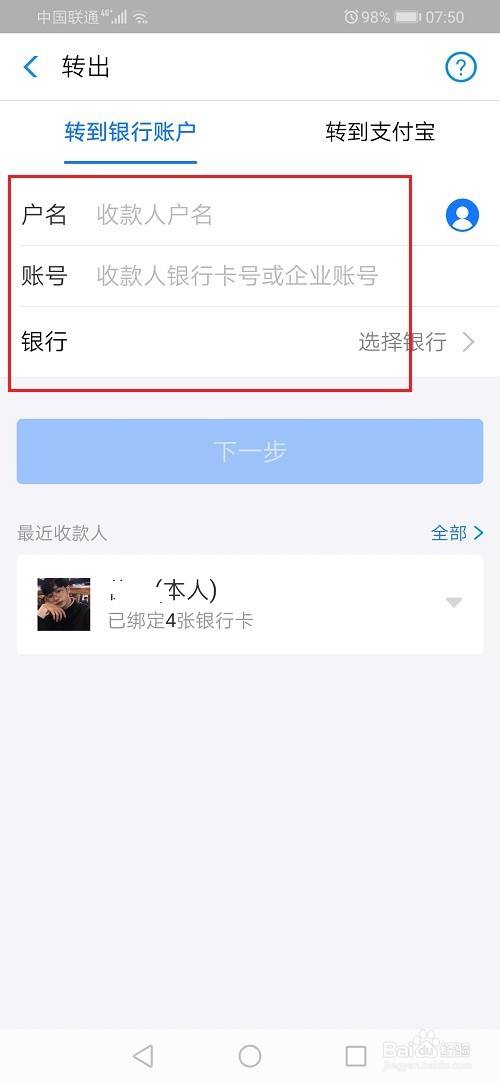 第四步进去之后,输入别人的姓名和银行卡号,可以转账到别人银行卡,如下图所示: