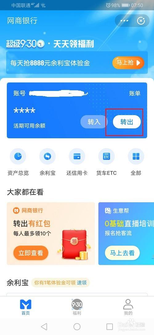 第三步进去网商银行首页之后,点击转出,如下图所示: