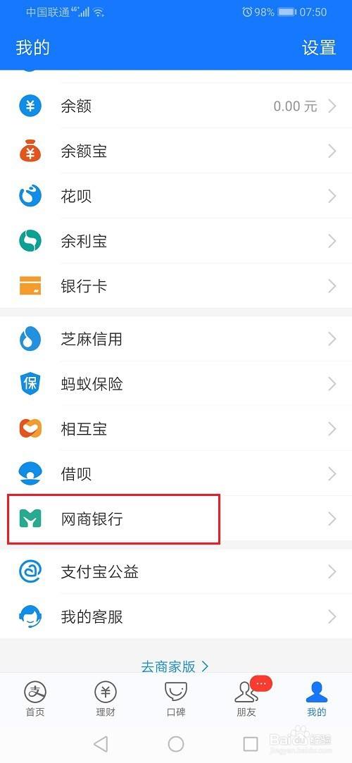 第二步下面来转账到别人银行卡,打开支付宝,进去我的界面,点击网商银行,如下图所示: