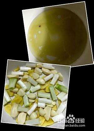 砂锅洗净擦干,倒入少许橄榄油刷满锅底,铺上蒜粒、姜片和葱段;