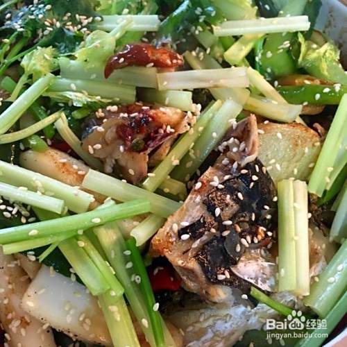 焖制时间到后(检查鱼头块是否熟透,未熟就再焖一会儿),撒上芹菜段汽断生,关火,撒香菜,香酥芝麻粒,即可连锅上桌。
