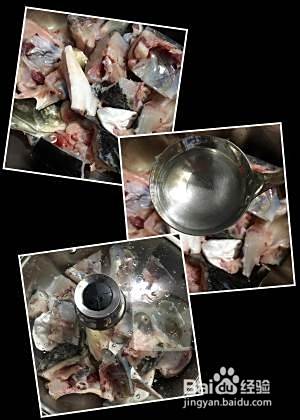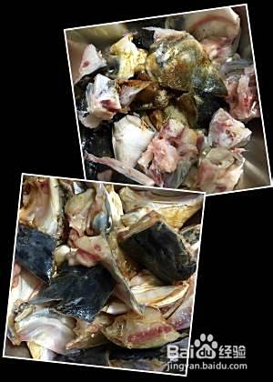 去腮剁成块的胖头鱼鱼头洗净沥干水分,装盆,浇适量高度白酒拌匀,盖上盖子闷几分钟后,冲洗干净,沥干;