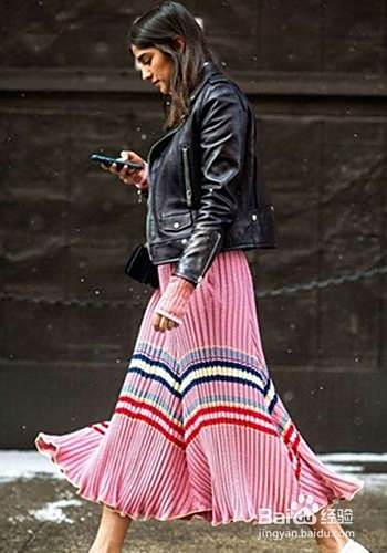 黑色皮衣+印花长裙,现在广东的天气这样穿也很合适