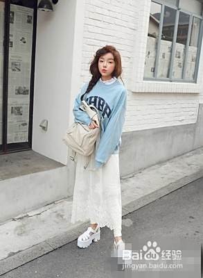 蓝衬衫+白色蕾丝裙+高跟鞋