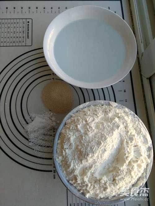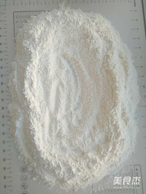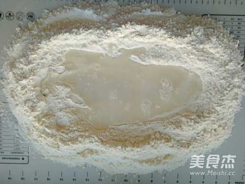 2(我习惯用和面垫,和面成团以后哪哪都干干净净的,比用和面盆要干净。当然,有人用不习惯的,也可以改回和面盆)将面粉与酵母、糖混合均匀,中间扒开一个坑。