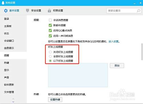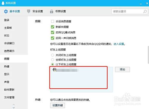 3、以下好友上线提醒,勾选这个选项后你需要在下面添加需要上线提醒的好友,只有在下面添加的好友上线才会提醒,其他好友不会提醒。