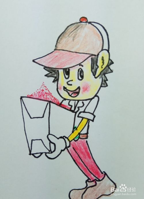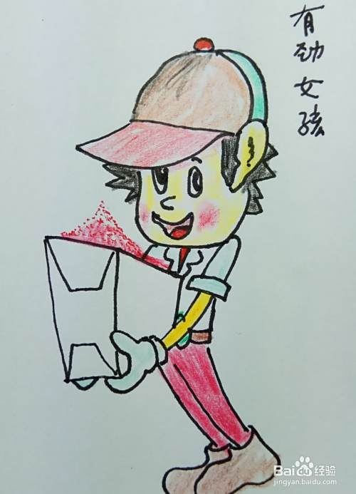 再用水彩笔涂这个女孩的裤子色彩和鞋子色彩,再重的东西也能搬得动,要相信自己,小女孩可真是厉害呀,修饰一下细节,简笔画就画好了。