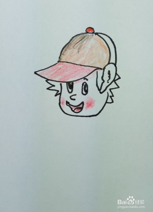 在白纸上用线条和曲线画出一个女孩的头部轮廓,然后再画出她的五官和头上戴着的帽子,并且涂出她的脸蛋色彩和帽子色彩。