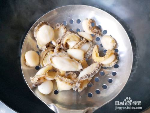 锅中宽水,水开下鲍鱼片关火,鲍鱼片一打卷就可以捞出备用