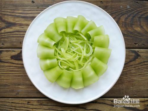 将青笋片如图摆盘,剩余的青笋切丝垫在盘中