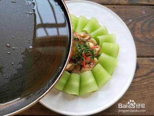 葱绿和小米辣摆在鲍鱼片上,淋上2勺柠檬蒸鱼酱油