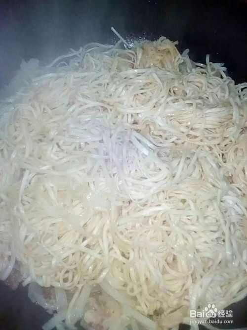 热锅中倒油,将萝卜丝倒入锅中,快速翻炒,加适量盐,继续翻炒,加点水,把面条平铺在上面
