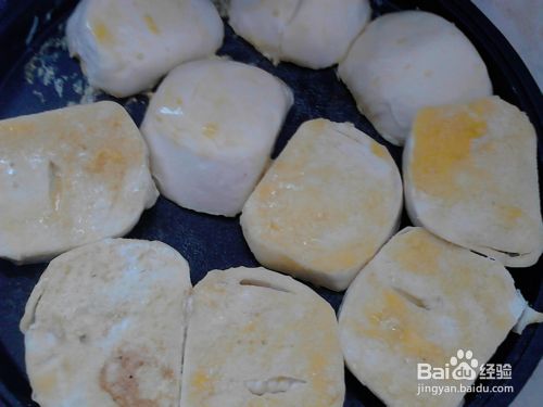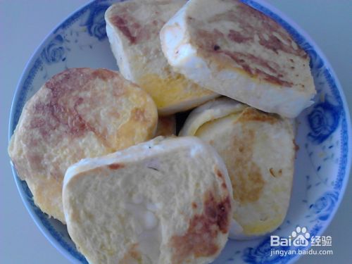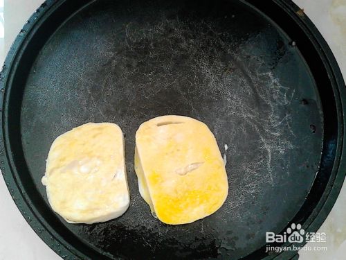 加热平底锅后,往锅中倒入薄薄的一层食用油,然后将沾有鸡蛋液的馒头片一个个放入平底锅中。
