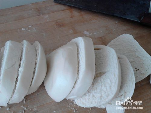 首先将之前吃剩的馒头用刀切成两厘米作用的馒头片。