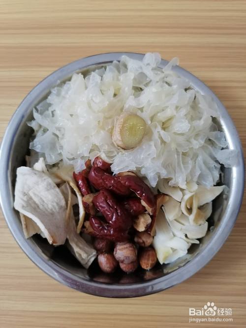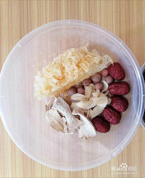 将红枣洗净去核,淮山和百合泡软;银耳浸水软化后,去蒂心,撕成小片;准备好冰糖和葛粉。