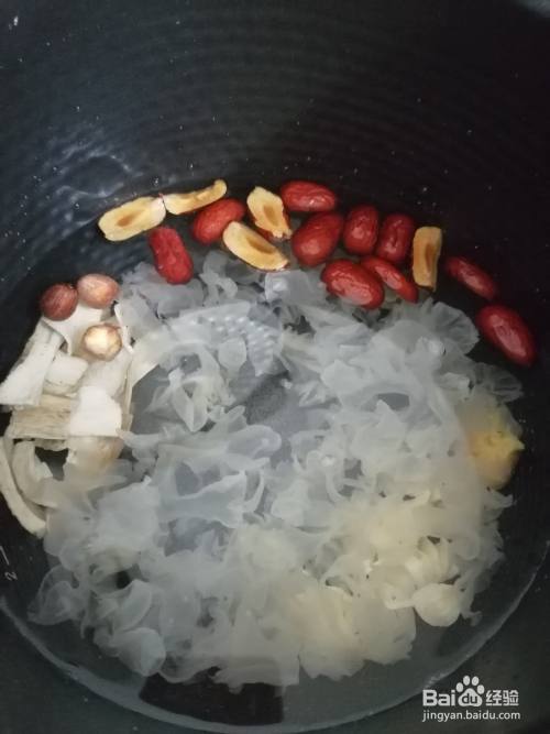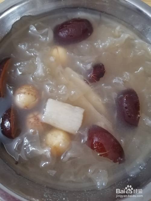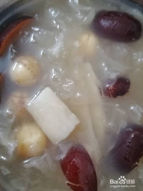 将银耳、淮山、百合、莲子、红枣倒入锅中,加入3碗半清水,大火煮开转中火煮45分钟。