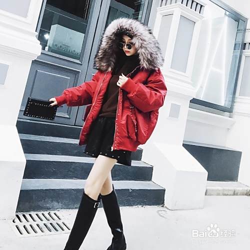 红色棉服不挑人,更加显得青春有活力,下身搭配一条黑色皮短裤,超显大长腿,再配上一双长筒靴。!超级级有范