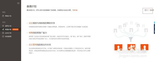 点击计划管理——自选计划,进入自选计划设置页面;点击右上角开启按钮,开启淘宝客后台自选计划