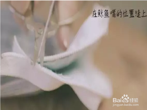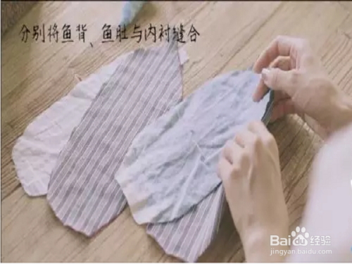 将剪好的布料,从鱼尾巴处开始缝合,并且填充棉花。如下图。