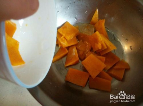 再把蒸好的南瓜倒入干净的容器中。