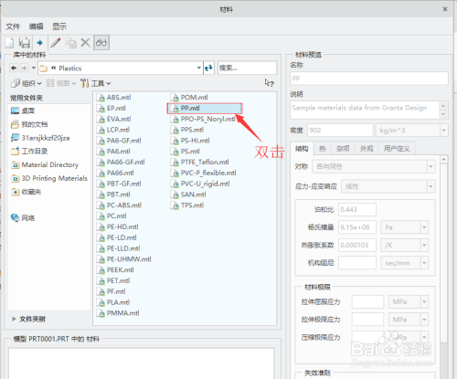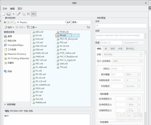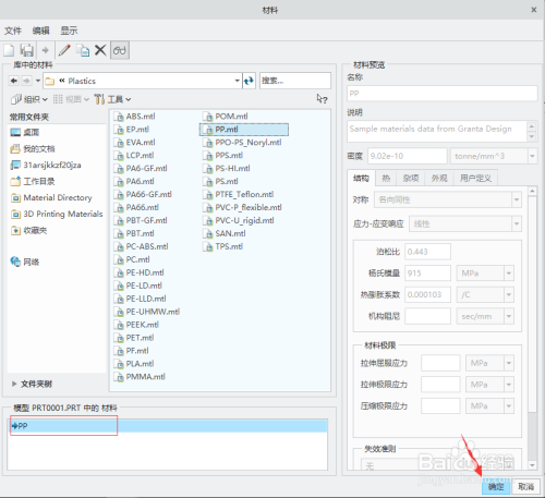 在弹出的”材料“对话框,在材料目录选择材料。(比如我选择PP材料,材料路径为:Material Directory →Standard-Materials_Granta-Design→Plastics 然后选择PP.mtl)