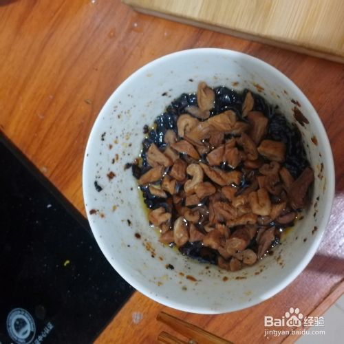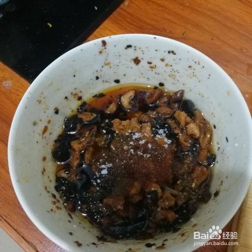 待碗内干辣椒油稍稍冷却之后在碗内倒入六月鲜、香醋、一点点盐和鸡精,搅拌均匀,然后倒入刚切好的萝卜干,