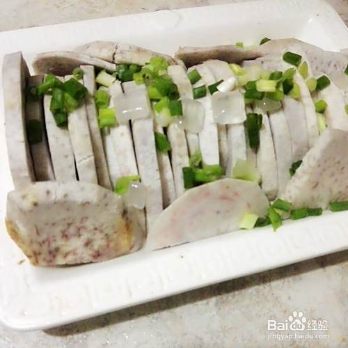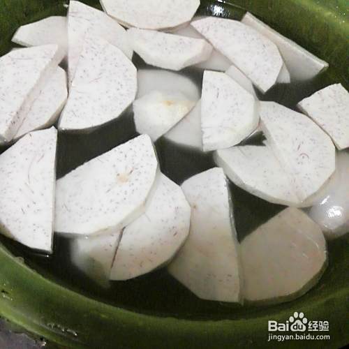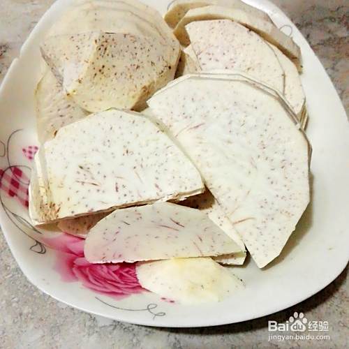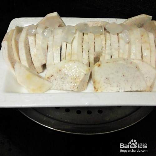 烧半锅水,水滚后把芋头片放上去隔水蒸十分钟。