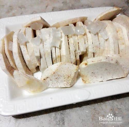 再把芋头拿出来控水再放在盘子里摆好。把冰糖放在芋头上