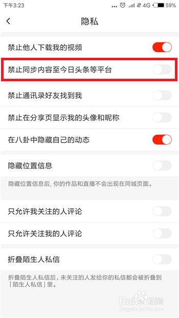 在隐私里面大家就可以看到【禁止同步内容至今日头条等内容平台】,把这个选项给关闭即可。