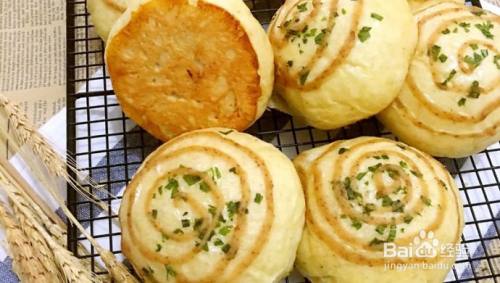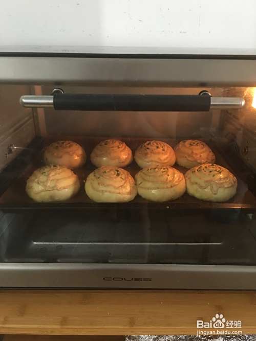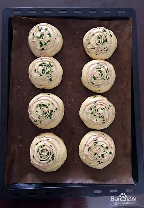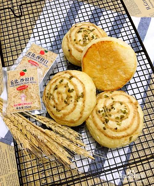 发酵至2倍大后,表面刷蛋液(可不刷)挤上沙拉汁撒上葱花。