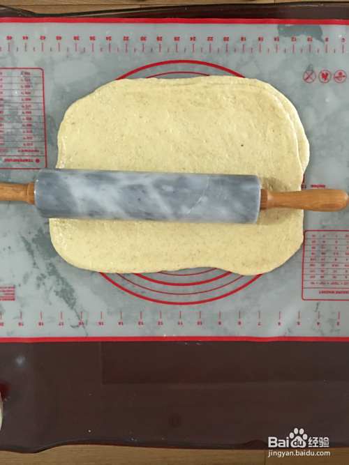 面团用擀面杖擀开(成长方形)排气,重复步骤2-3次。