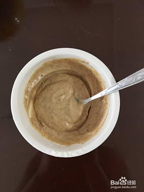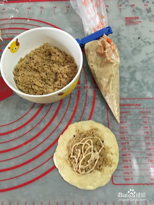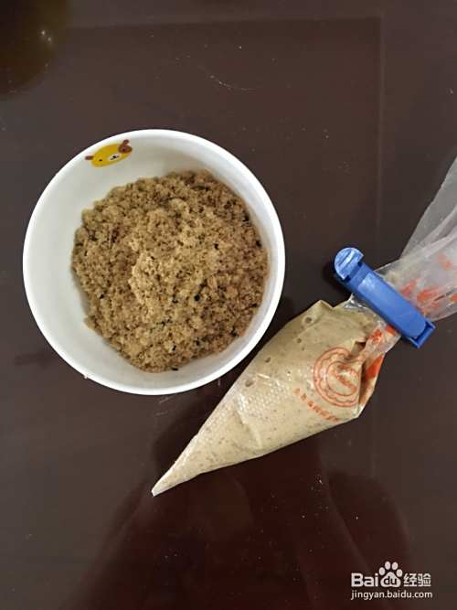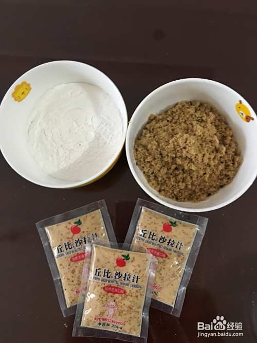 备好肉松,把焙煎芝麻口味的丘比沙拉汁倒入小碗中,调入适量的糯米粉拌匀,浓稠即可。