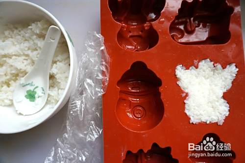 首先蒸一锅米饭,米饭要松软,蒸好后盛出,便当盒浅浅的铺上2/3位置的米饭,准备一个模具(如果没有模具,可以选择米团的做法,加上眼睛,园嘴巴,就可以成为一个小猪),带上一次性手套将米饭用力挤压,放入模具。在小心的扣出。