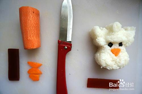 将动物米团做好后,紫菜剪成圆状,安上眼镜,在用胡萝卜切成薄片,切成三角状,边角轮廓要椭圆,不要太尖,做成鼻子。用山楂糕剪成胡子和耳朵,动物米团就做成了