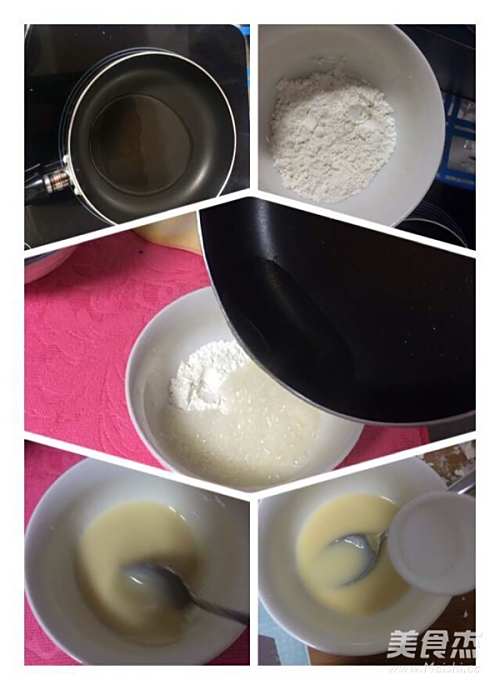 利用醒面的时间,在碗里放一些面粉,食用油热锅烧开浇在面上搅拌均匀,放少许盐,备用