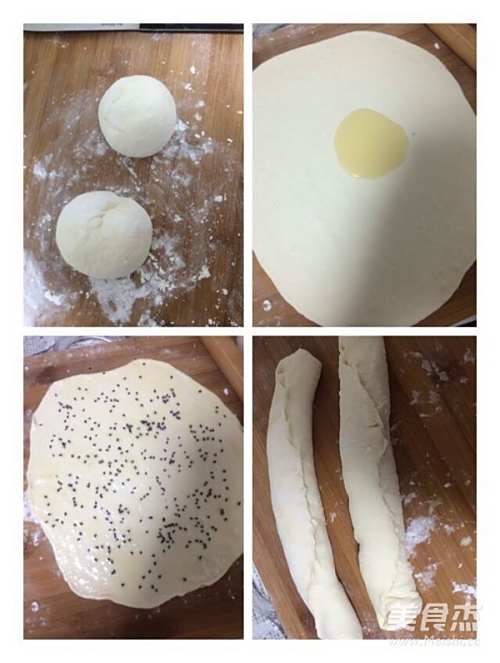 醒好的面揉成光滑面团分成两部分,擀成薄片,倒上炒油面,均匀铺好,撒上芝麻、卷成图的样子