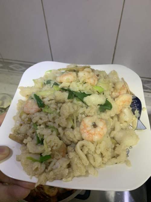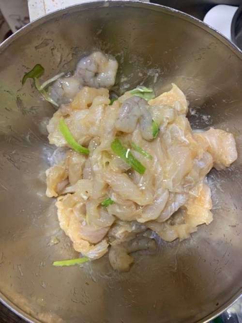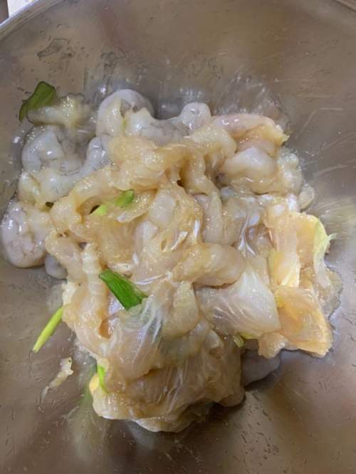 4调料搅拌均匀,想到剩了点虾仁也一起放进去了。